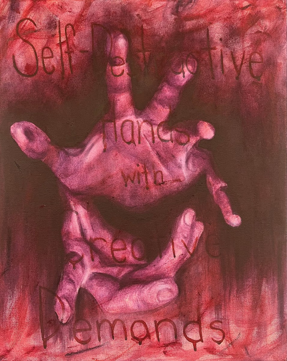 This internal (thought) to external (experience) struggle is represented through layering and transparency techniques of oil on canvas with the purpose of overlapping text with realistic visual imagery. The text comes first acting as inspiration for the visual imagery. Although the text is key to the start of the creative process, as the imagery is being layered on top of the text it starts to become obscure and difficult to fully read. This is intentional as it metaphorically represents the want to mask the turmoil of negative thoughts and emotions that come with mental illness from being seen on the surface by an outside view.